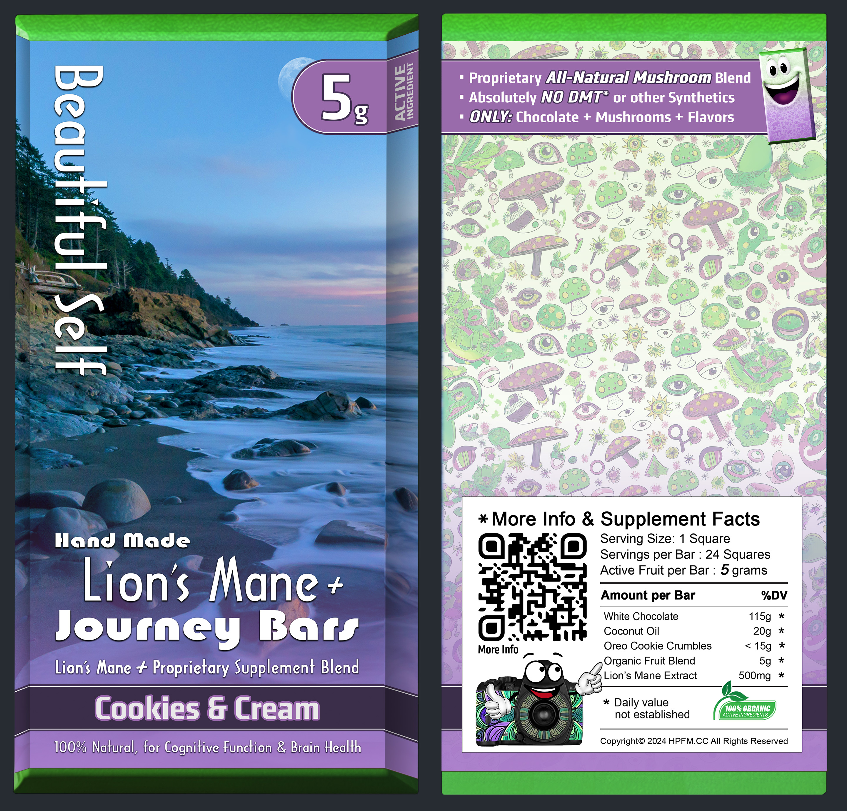115g Chocolate, 15g Cacao Butter, 15g Flavoring, + 500mg Lion's Mane & 2g Cacao Powder (Vasodilator)