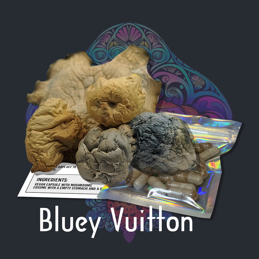 The Allure of Bluey VuittonBluey Vuitton mushrooms are renowned for their exceptional potency and visually captivating blue coloration, a result of the heightened presence of psychoactive alkaloids. This strain has become a treasure within the underground mycelium network, with its strong effects, enchanting appearance, and robust production making it a favorite among enthusiasts and cultivators alike.