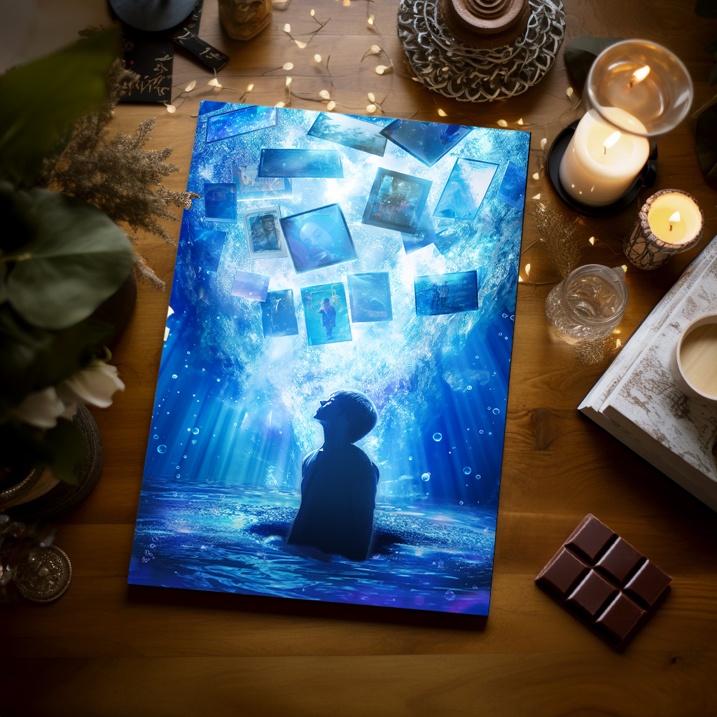 As the viewer's eyes are drawn into the image, they are met with a mesmerizing display of memories and past events, represented by a collage of floating images that trail out from the back of the man's head. These images, swirling and whirling around him, symbolize the layers of experiences, emotions, and insights that make up the individual's unique identity. The man's expression of new-found awareness and amazement invites the viewer to engage with their own personal narrative, to uncover the hidden depths of their own "Deep Self."